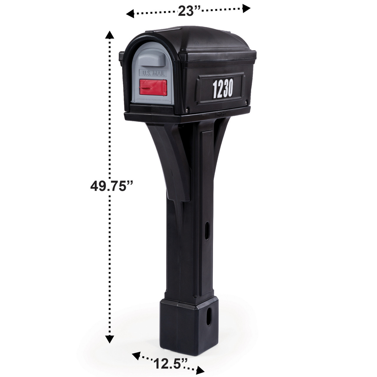 IN THE BOX: Mounting hardware, post cover, red flag mail indicator, and home address adhesive mailbox numbers included.