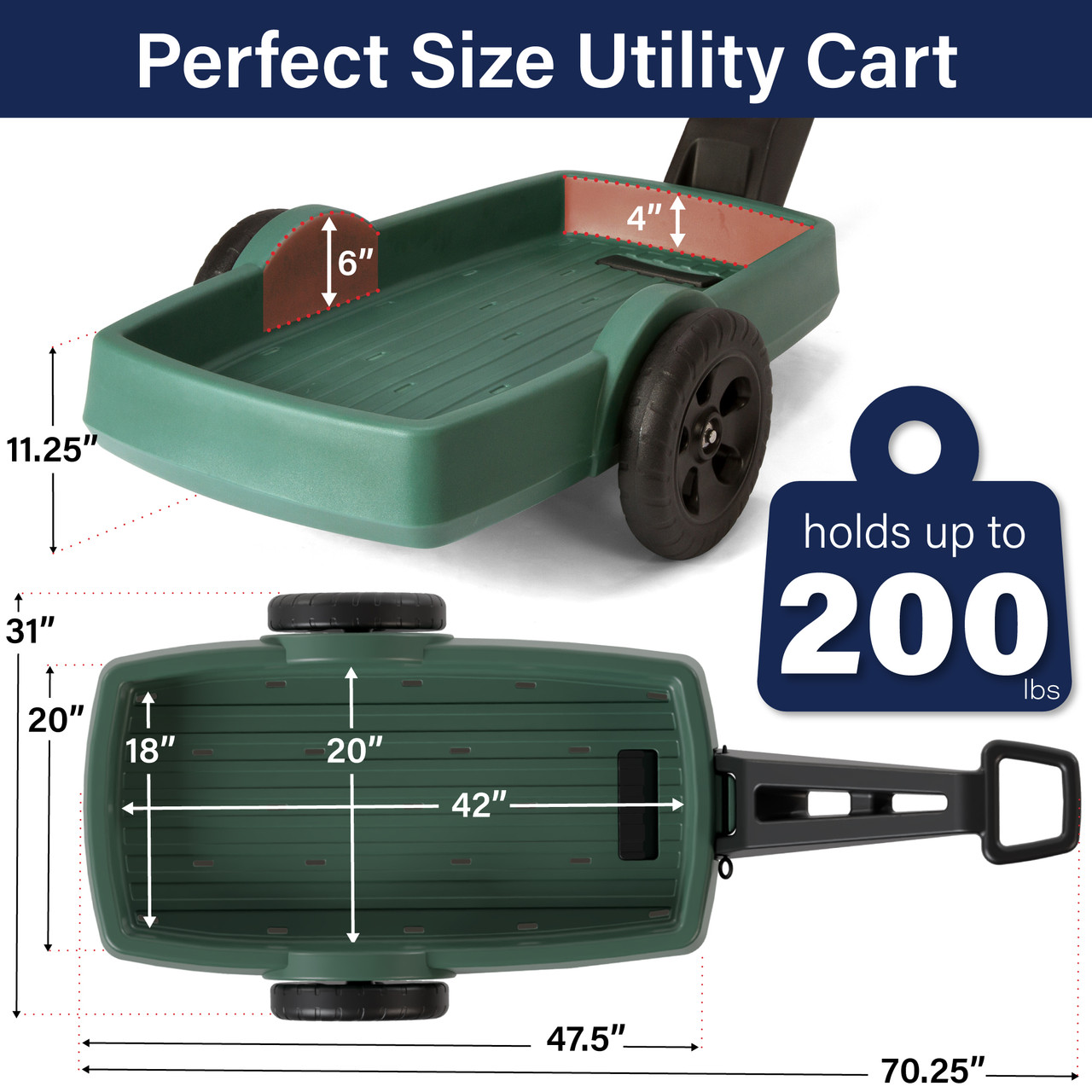 HEAVY DUTY CART: Durable, double wall plastic construction yard cart withstands heavy loads as well as outdoor elements without rusting or denting. It can even overwinter in the backyard. Holds 200 lbs.
