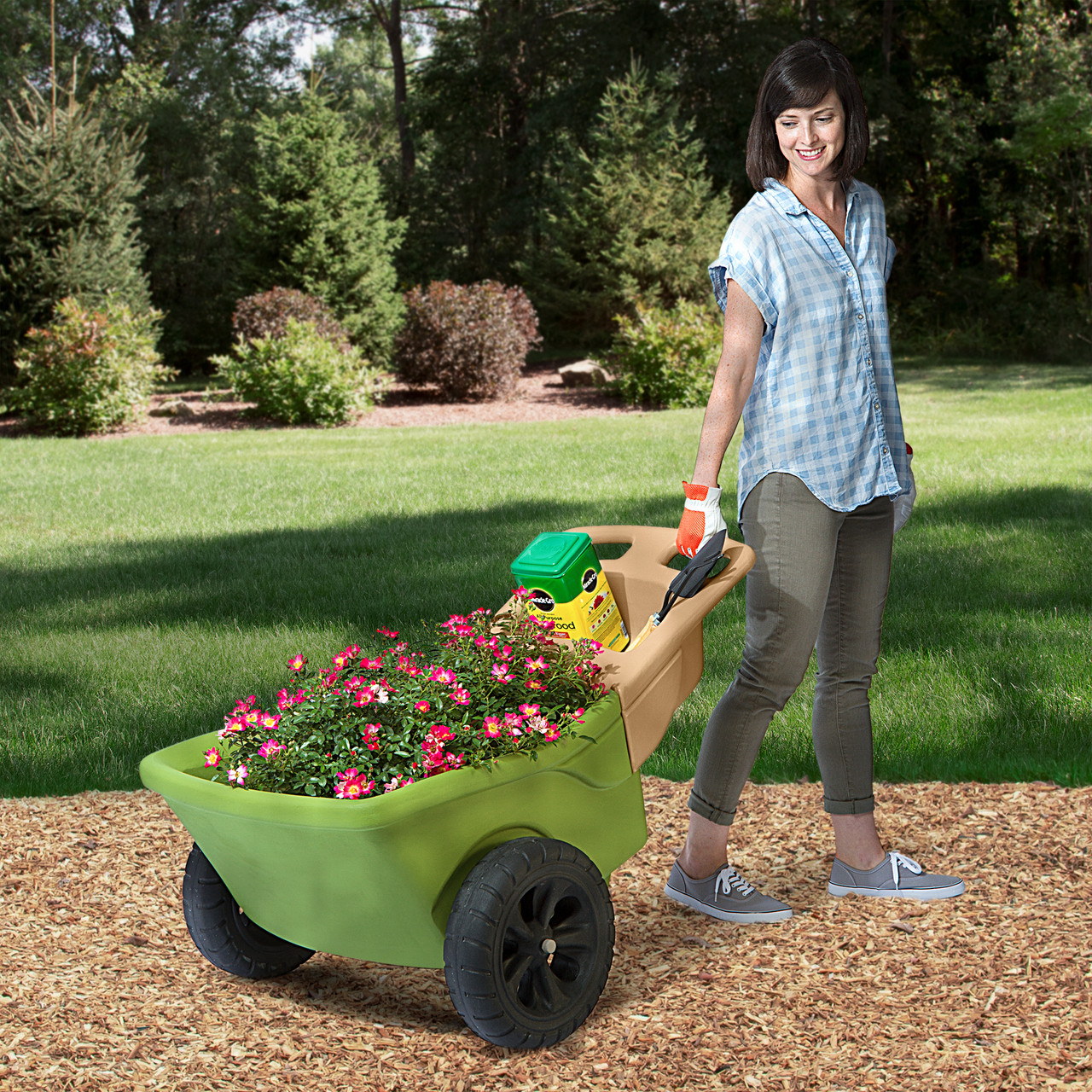HEAVY DUTY - DURABLE: Double wall plastic construction garden cart holds heavy loads up to 200 lbs. as withstands outdoor elements without rusting or denting. It can even overwinter in the backyard.