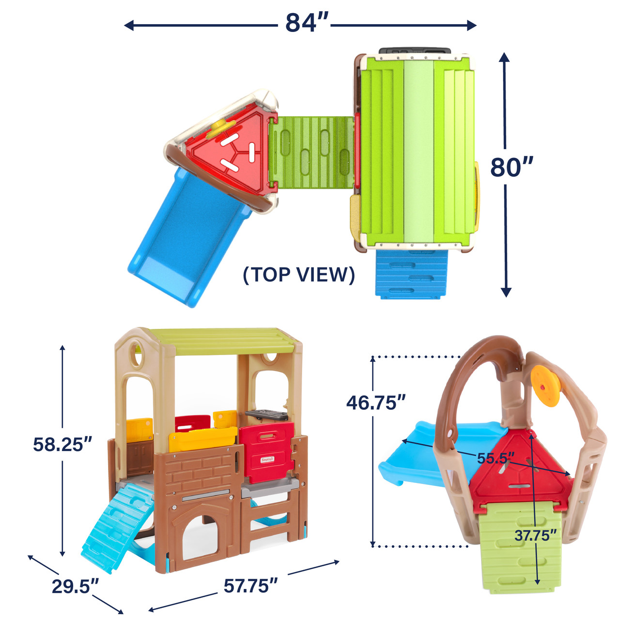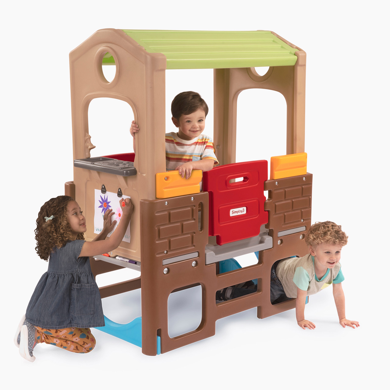 The customizable Discovery Activity Playhouse Climber Set from Simplay3 is a modular backyard playground set that combines the fun of a climber and pretend play value of a playhouse that could entertain the entire neighborhood. Each inclusive play unit can be used as an outdoor playset or indoor playground and enjoyed by itself - or joined together to add to the adventure and build an even bigger multiple child outdoor playset. Three different possible playset configurations let families customize to fit their backyard playground or indoor playroom. Features include a toddler slide, working dutch doors, kids playhouse with kitchenette, steering wheel, climbing ramps, ladders and even a drawing easel. This toy for toddlers and kids is made with durable, double-walled plastic construction that won’t chip, fade, or peel and will stand up to the toughest of play. Its child-friendly rounded edges and smooth surfaces won’t splinter or crack and are kind to little hands. Plus, parents love it because it’s easy to clean, low maintenance and will keep kids of varying abilities active for hours! Best of all, it’s made in the USA.